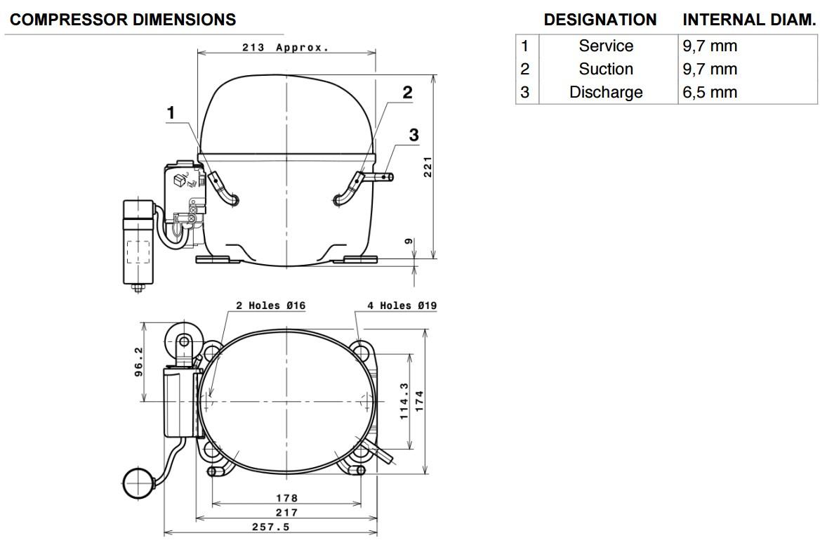 - Холодопроизводительность: 0,629 кВт (при Ткип. = -35°С и Ткон. = +40°С)